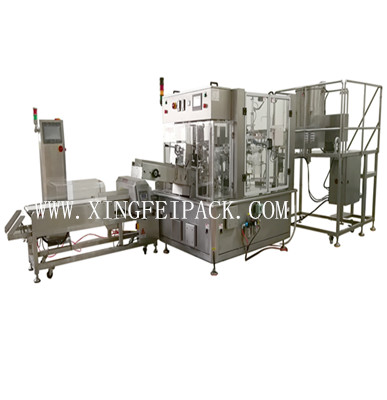 包裝流程(工位分布):1)上袋—2)色帶(噴碼)打碼(選項(xiàng))—3)開自立袋底—4)開袋口—5)一次充填—6)二次充填(選項(xiàng)或者備用)—7)熱封口(同時(shí)排氣)—8)冷封口和產(chǎn)品輸出。