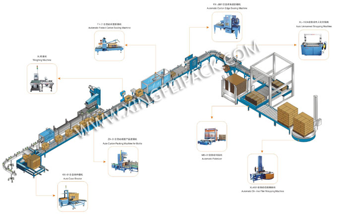 我司可根據不同產品及要求設計定制整條紙箱包裝線,從紙箱成型到后面碼垛纏繞膜包裝。適用于瓶裝,袋裝,罐裝等產品。歡迎來信來電咨詢。